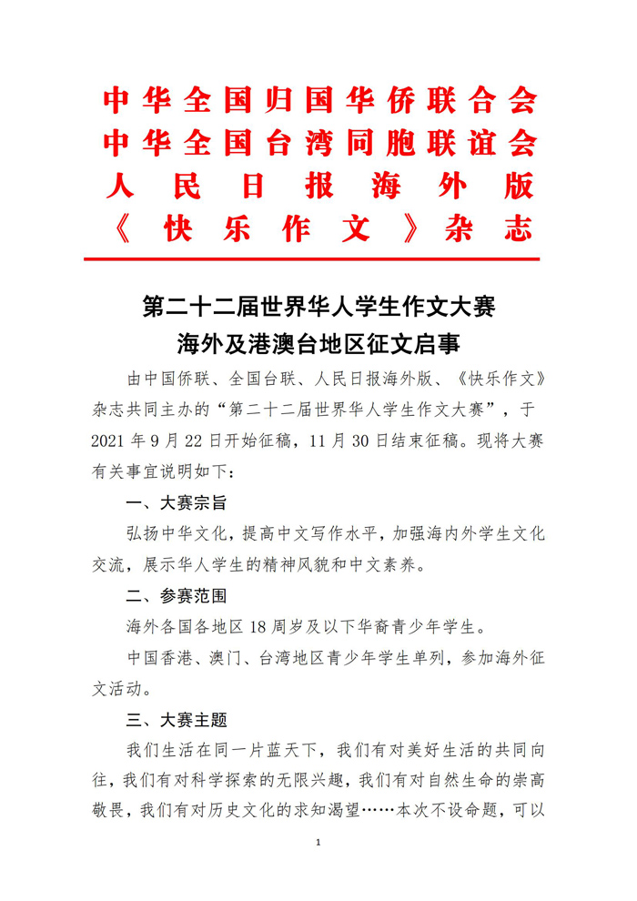 第二十二届世界华人学生作文大赛海外及港澳台地区征文启事