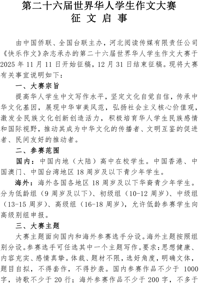 << 上一篇: 第二十六届世界华人学生作文大赛征文启事